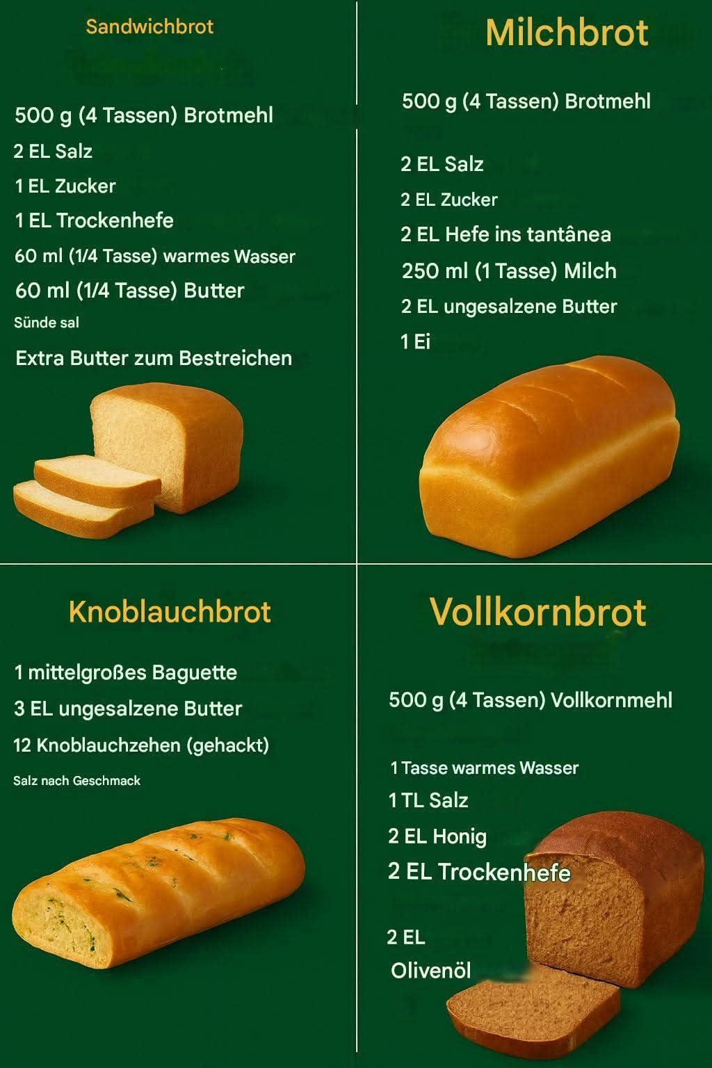 1. Grundrezept Weißbrot Zutaten: 500 g (4 Tassen) Mehl 2 TL Salz 1 EL Zucker 1 EL Trockenhefe 60 ml (1/4 Tasse) warmes Wasser 60 ml (1/4 Tasse) Milch 2 EL ungesalzene Butter Extra Butter zum Bestreichen Zubereitung: Wasser, Hefe und Zucker verrühren und 5–10 Minuten schaumig stehen lassen. Mehl, Salz, Milch und Butter hinzugeben … Read more