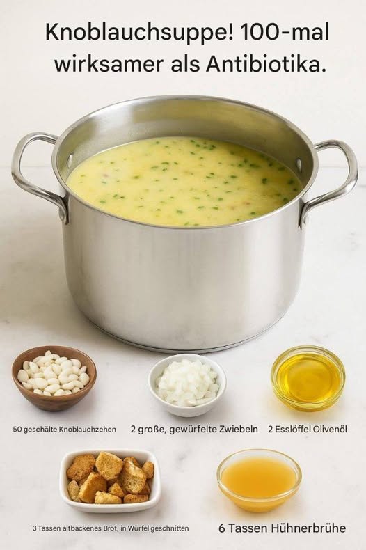 Knoblauchsuppe: 100-mal wirksamer als natürliche Antibiotika! Dieses altbewährte Hausmittel stärkt das Immunsystem und bekämpft Infektionen auf natürliche Weise. Eine Suppe reich an Allicin, einem starken antibakteriellen Wirkstoff aus Knoblauch 👇 🥣 Zutaten: 50 geschälte Knoblauchzehen 🧄 2 große, gewürfelte Zwiebeln 🧅 2 Esslöffel Olivenöl 🫒 3 Tassen altbackenes Brot, gewürfelt 🍞 6 Tassen Hühnerbrühe 🍲 … Read more